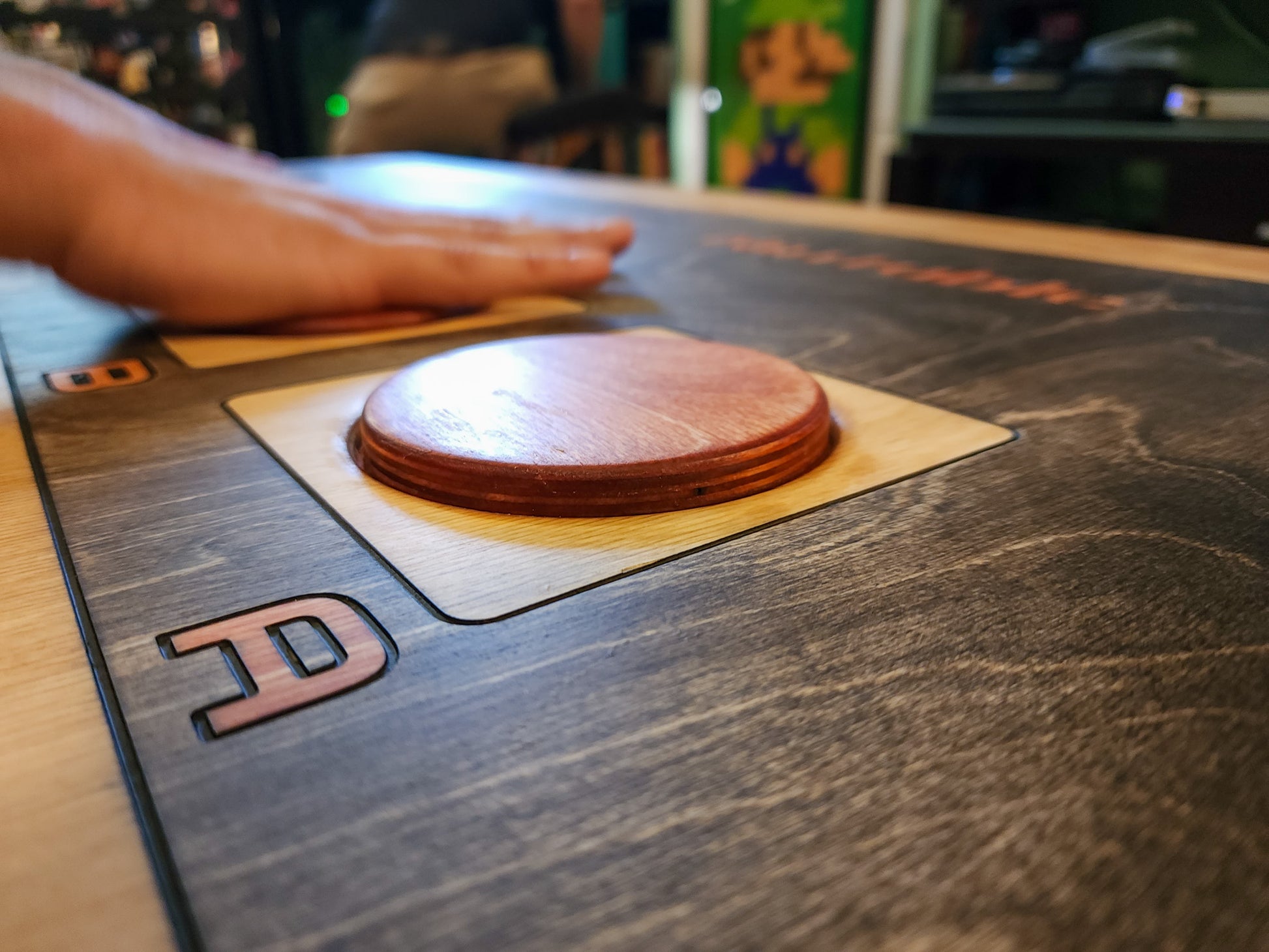 The buttons all float on springs with replaceable Cherry MX microswitches. Drainage trenches carry the inevitable spilled drink away from the electronics and the table is easily opened for cleaning and maintenance. The legs are easily removable without tools for storage and portability.